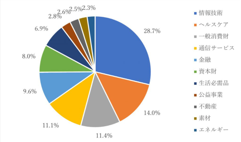 情報技術セクターが28.7%と、全体の4分の1以上を占めており、マーケット状況が良い時は、S&P500を支える存在となります。
