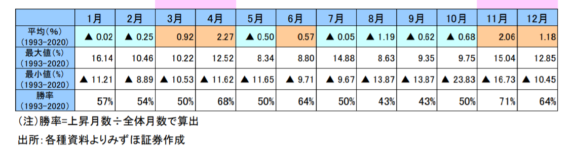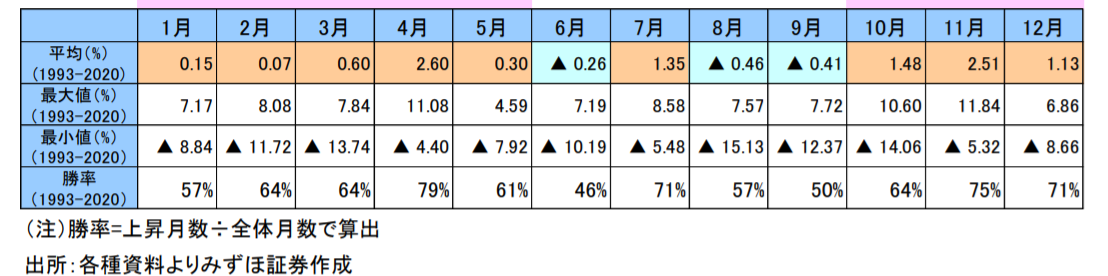 みずほ証券のレポートでは、NYダウの場合、6月、8月、9月が青色のマイナスになっています。