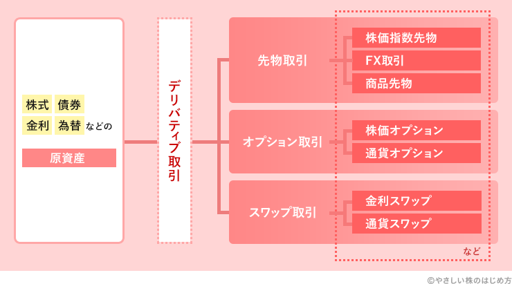 デリバティブとは、先物取引、オプション取引、スワップ取引などの総称で、「金融派生商品」とも呼ばれます。