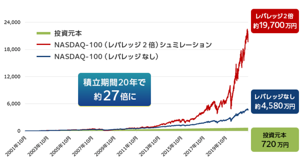 成長性が高いNASDAQ-100指数の値動きに対して、2倍になるようにレバレッジをかけて運用する投資信託「レバナス」。