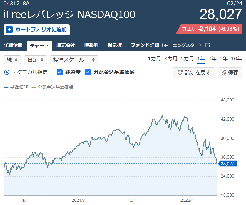 実は、今まさにNASDAQ-100は下落相場にあります(2022年2月24日現在)。
