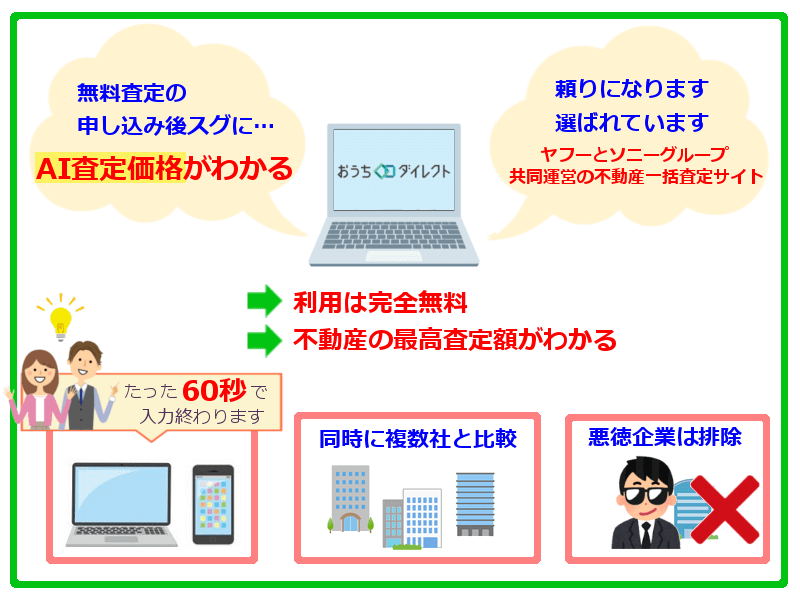 おうちダイレクトだと、自分の不動産に強い複数の不動会社の査定結果が分かりますので、自ずと最高額がわかるわけです^^