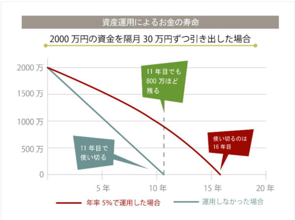 こちらの図では、2,000万円を一括で引き出して使用した場合と、年利5%で運用しながら30万円を引き出した場合とを比較しています。