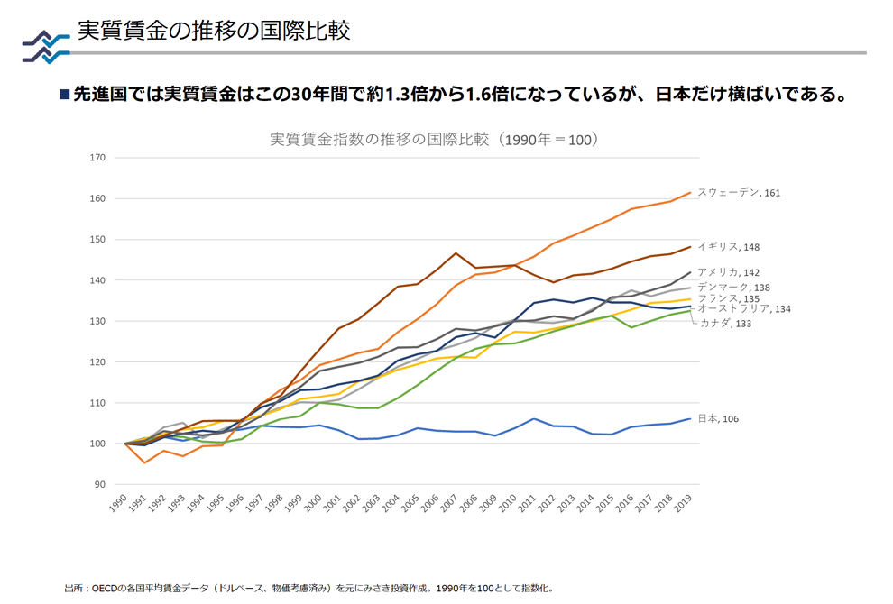 しかし過去30年間の世界の賃金指数を比較したデータでは、日本以外の先進国で数値が上昇しているものの、日本の賃金は横ばいが続いています。