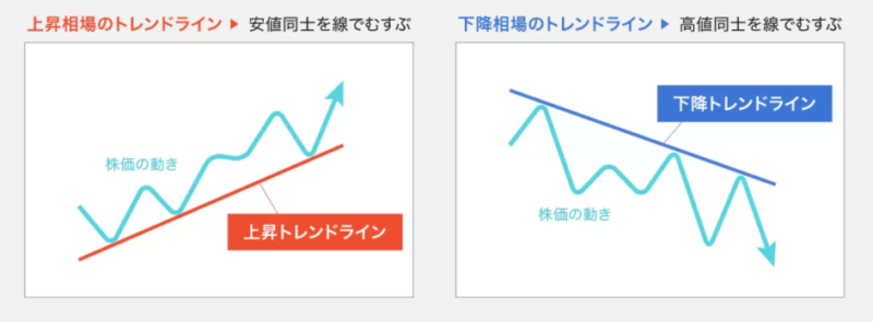 チャートの安値と高値の頂点を上記の画像のように結び、3点以上右上に進んでいたら上昇トレンドとなり、一般的に株の買い時といわれるタイミングとなり、逆に3点以上右下に進んでいたら下降トレンドとなります。