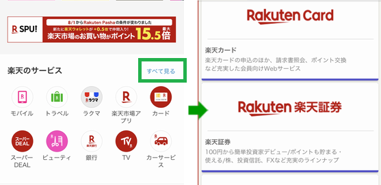 楽天市場のTOPページの少し下にある、楽天サービスの「すべてを見る」をタップ。