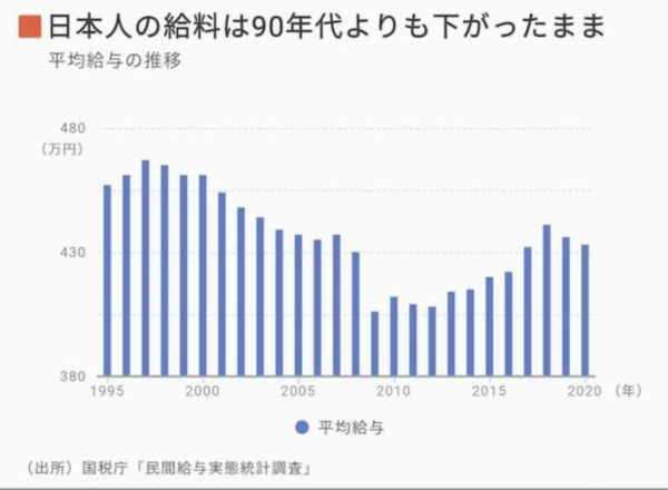 しかも現在の日本の平均給料は1990年代よりも下がった状態が長く続いており、最近になってまた下降傾向にあります。