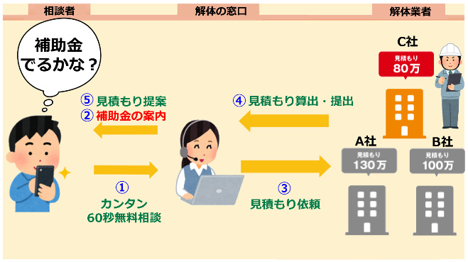 『解体の窓口』という、補助金申請のサポートと解体工事費用の最安値を、無料で知れるサービスです。