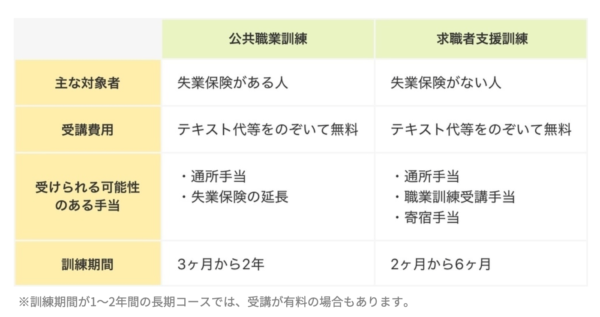 また「公共職業訓練」と「求職者支援訓練」の2つに分かれており、それぞれ対象者や条件が異なります。