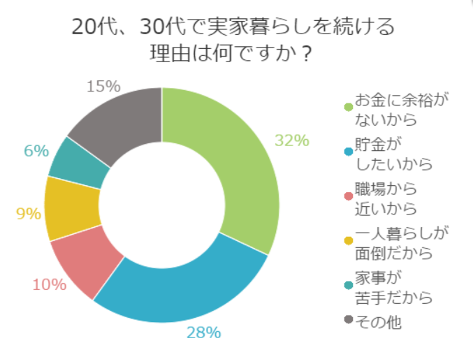 2017年に20~30代の実家暮らしの人に対して行われた調査では、実家暮らしを続けざるを得ない理由として「貯金がしたいから」「お金に余裕がないから」と金銭的な理由を回答した人が全体の6割を占めています。