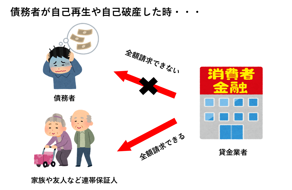 しかし、債務者が個人再生もしくは自己破産するとなると、貸金業者は債務者から全額返済してもらうことが不可能になるため、連帯保証人に一括請求をかけるのです。