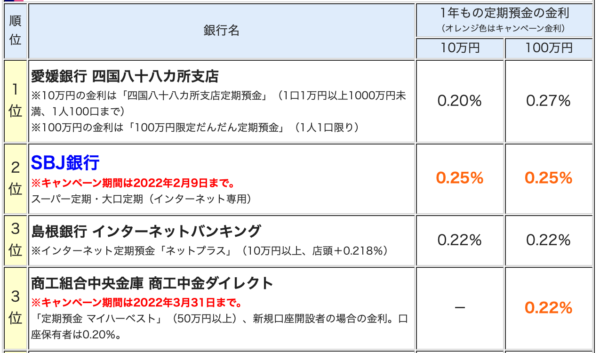 こちらも対象はインターネットバンキングのみで、新規口座開設で定期預金をした場合の金利が0.22%となります。(既に口座を持っている場合は0.2%)