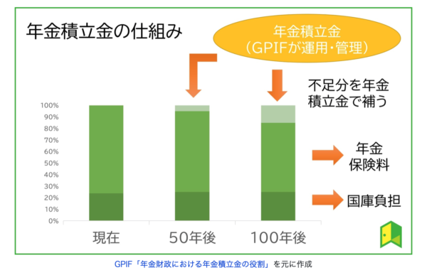 GPIFが管理しているのは公的年金の中の「年金積立金」で、将来的に不足するであろう年金保険料を補うことを目指しています。