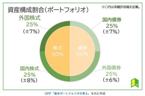 GPIFのポートフォリオは、国内・海外の債券・株式がそれぞれ25%ずつとなっており、リスク分散されています。