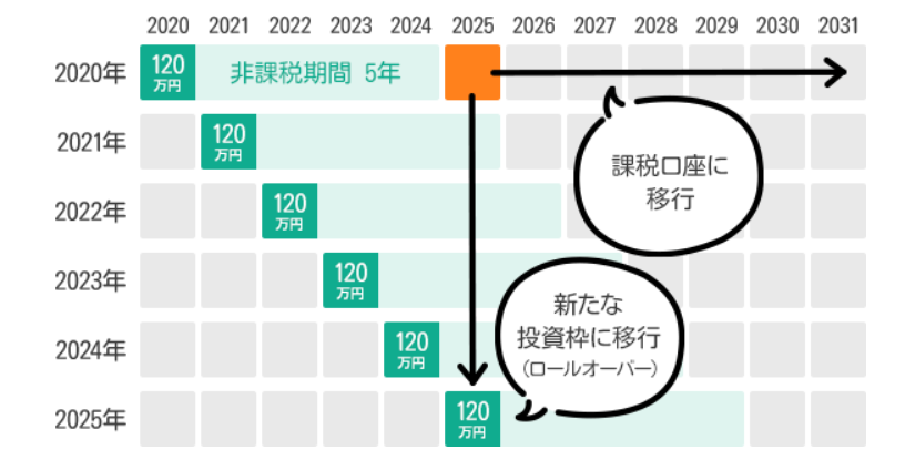 ロールオーバーの手続きを行い、金融商品を翌年のNISA枠に移行することで再度5年間非課税で運用できるのです。